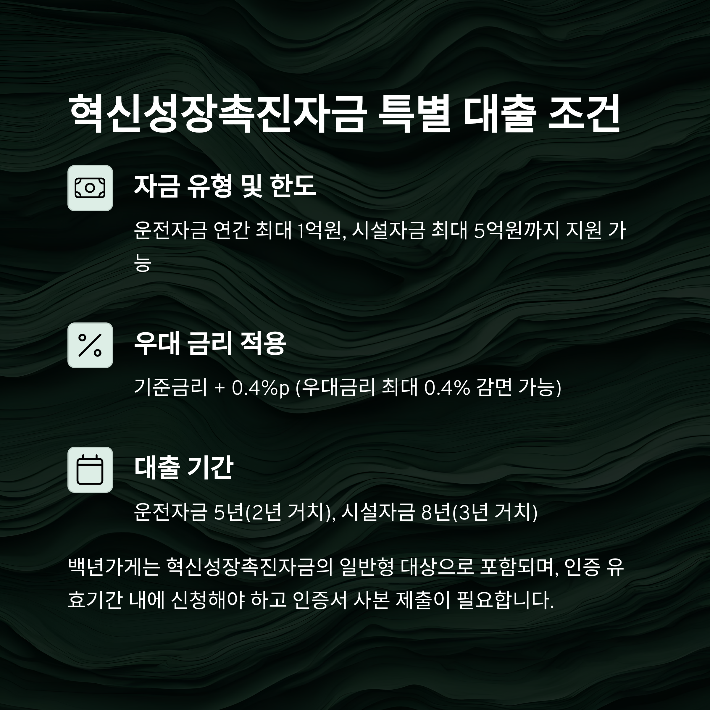 | 대출기간 | 운전자금 5년(2년 거치), 시설자금 8년(3년 거치) |