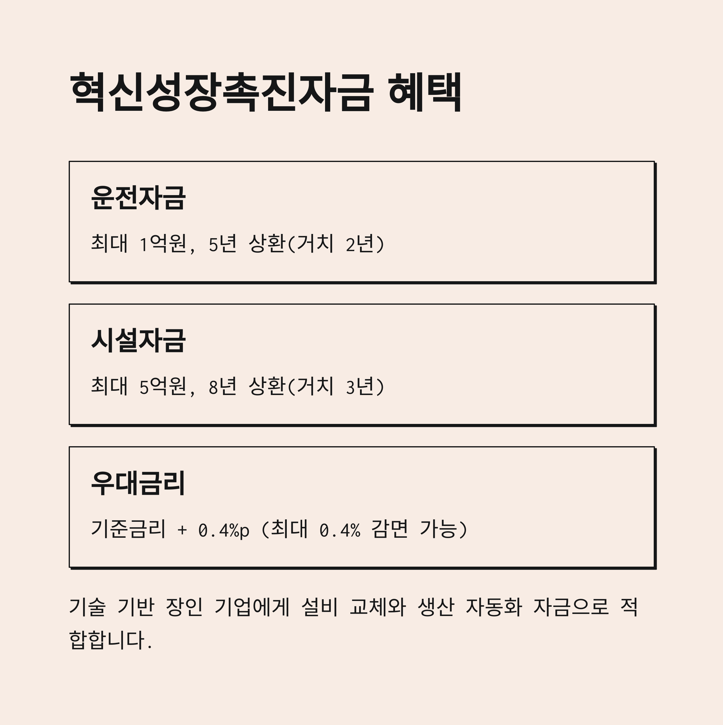| 상환 조건 | 운전자금 5년(거치 2년), 시설자금 8년(거치 3년) |