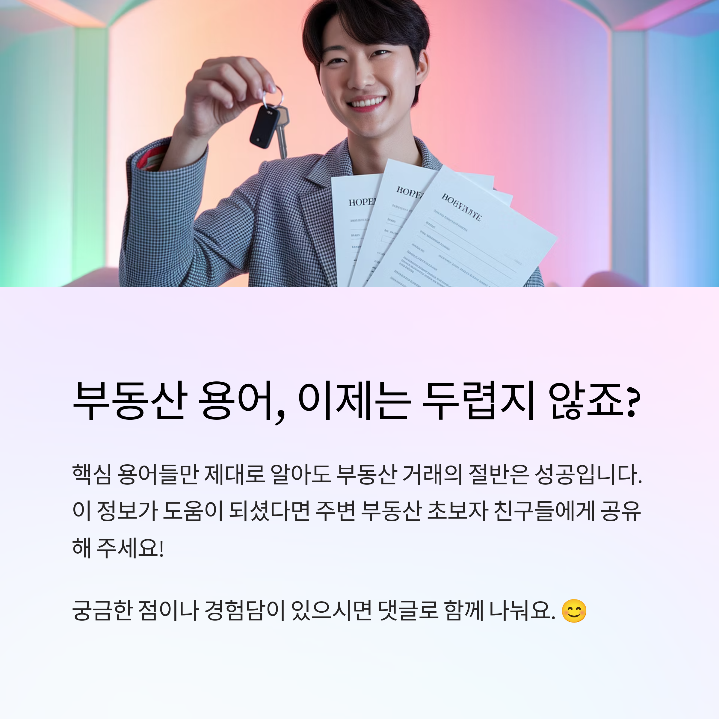 여기까지 읽어주셔서 정말 감사합니다! 부동산이라는 게 생각보다 복잡하고 헷갈릴 수 있지만, 핵심 용어들만 제대로 알아도 절반은 성공이에요. 저도 처음엔 정말 아무것도 몰랐는데, 하나씩 배워가며 이제는 웬만한 용어는 술술 이해할 수 있게 됐거든요. 여러분도 이 글을 통해 조금이라도 덜 막막하고, 더 자신감 있게 부동산을 마주할 수 있길 바랄게요. 혹시 궁금한 용어나 경험담이 있다면 댓글로 함께 나눠요. 😊