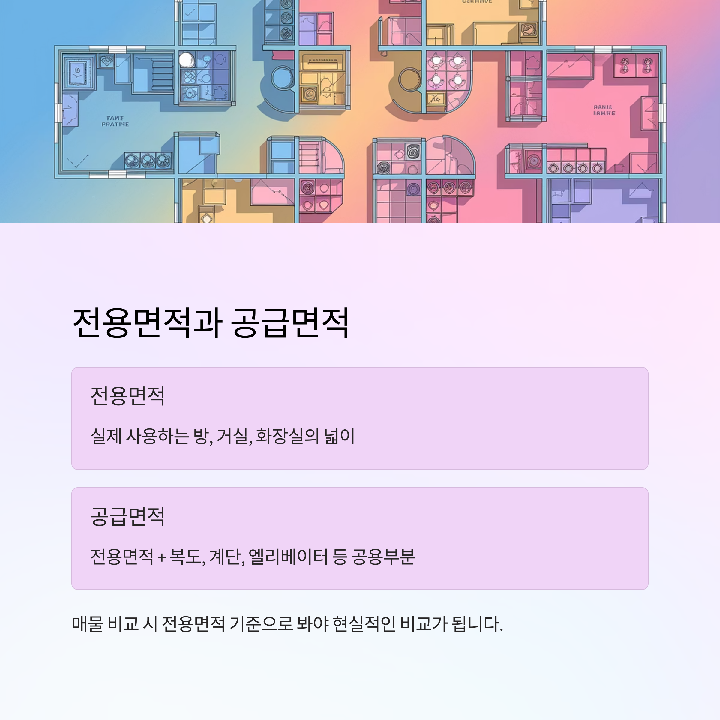"33평 아파트"라고 광고하길래 입주했더니 방 하나 빼고 다 복도라서 놀란 적 있으신가요? 그게 바로 공급면적과 전용면적의 차이 때문이에요. 전용면적은 실제 내가 사용하는 방, 거실, 화장실의 넓이고요, 공급면적은 여기에 복도, 계단, 엘리베이터 같은 공용부분을 포함한 넓이예요. 부동산 매물 비교할 땐 꼭 전용면적 기준으로 봐야 현실적인 비교가 됩니다.