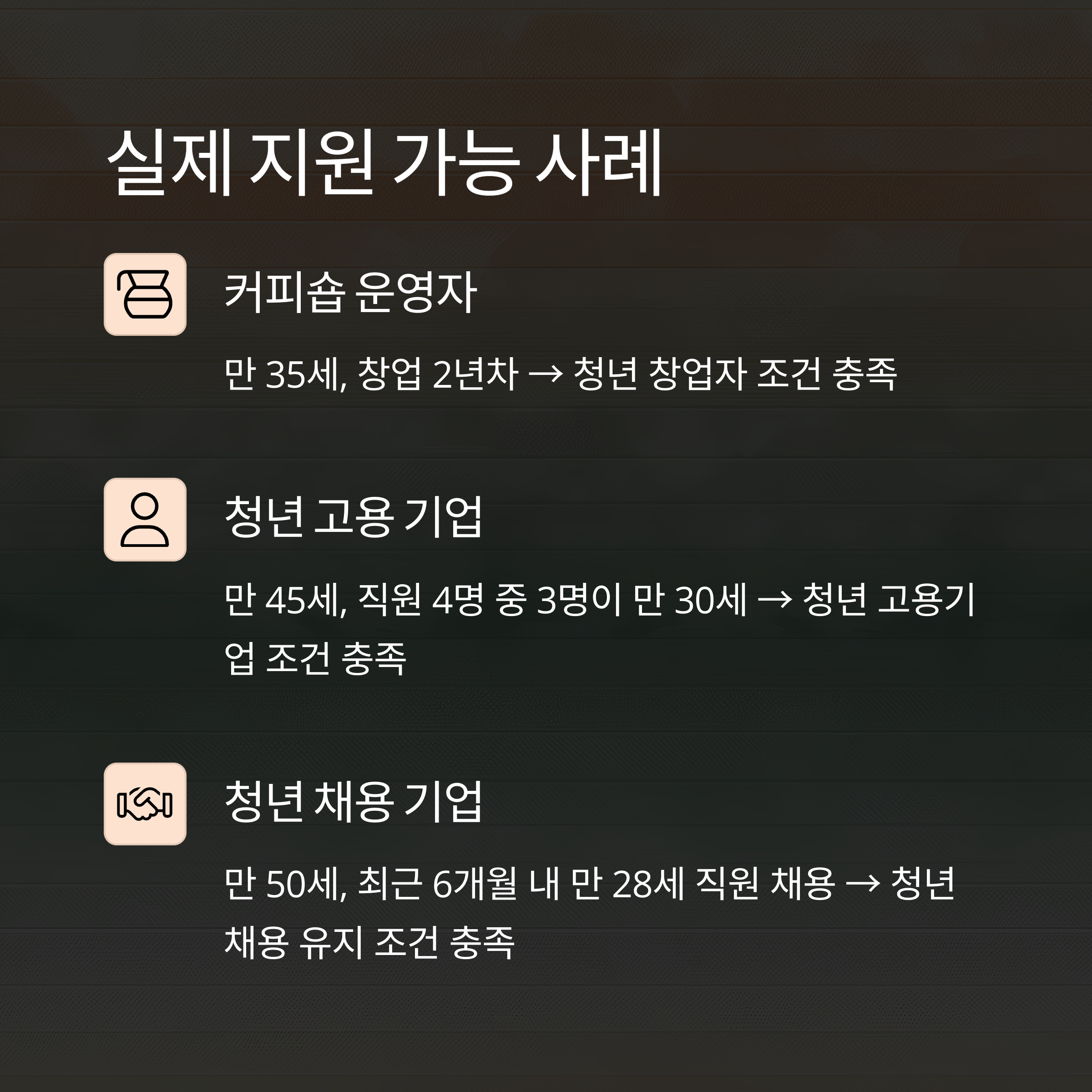 • 만 35세, 창업 2년차 커피숍 운영자 → ① 청년 창업자 조건 충족