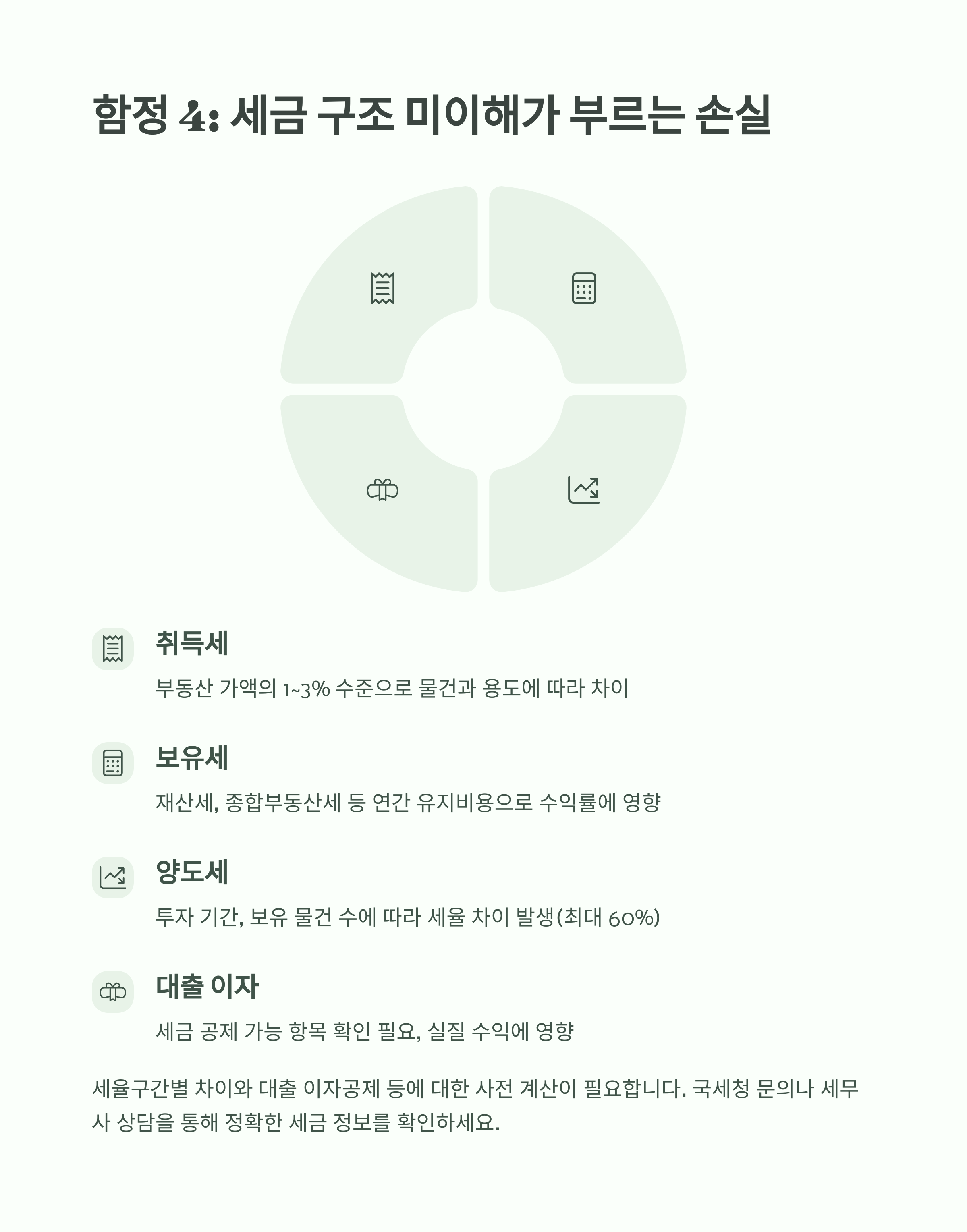 이로 인해 계약 해지가 어렵거나 분쟁의 원인이 될 수 있죠. 네 번째는 세금 구조에 대한 이해 부족입니다. 부동산 매매에는 취득세, 양도세, 종부세 등 다양한 세금이 부과됩니다.