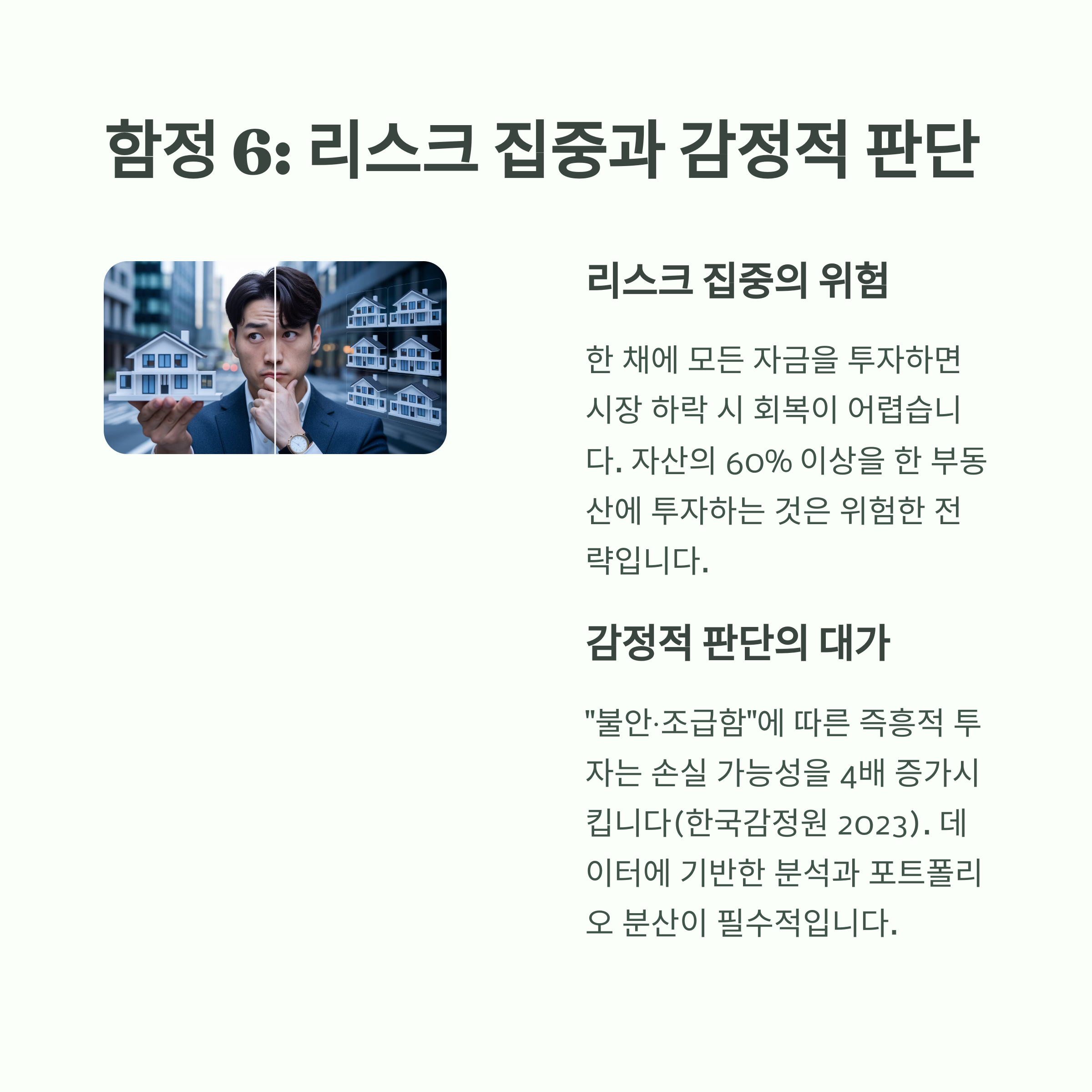 여섯 번째는 리스크 분산 부족입니다. 모든 자산을 한 채의 부동산에 집중 투자하는 경우 시장 급락 시 큰 손실을 볼 수 있으니 분산 투자를 고려해야 합니다.