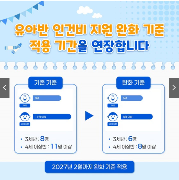 이를 해결하기 위해 정부는 유아반 인건비 지원 완화 기준을 2027년 2월까지 연장하기로 했습니다.
