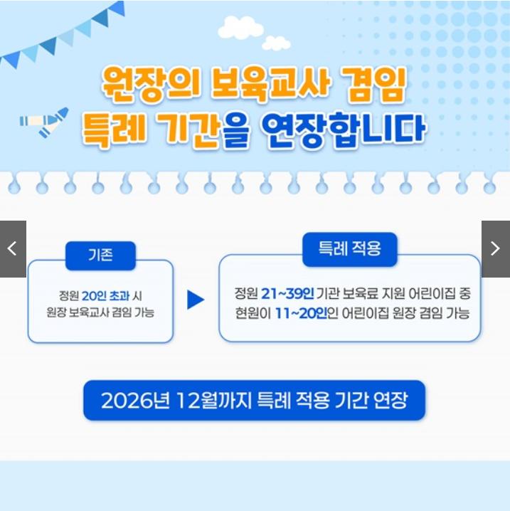 또한, 소규모 어린이집 원장님이 보육교사를 겸임할 수 있는 특례 기간도 2026년 12월까지 연장됩니다.