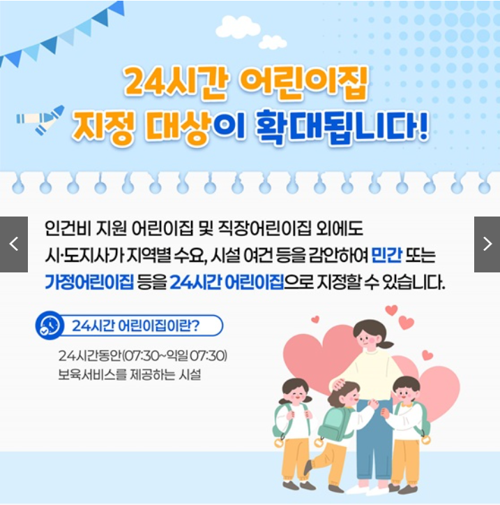 기존에는 주로 국공립이나 직장어린이집 위주였지만, 앞으로는 민간과 가정어린이집도 24시간 지정이 가능해져요.