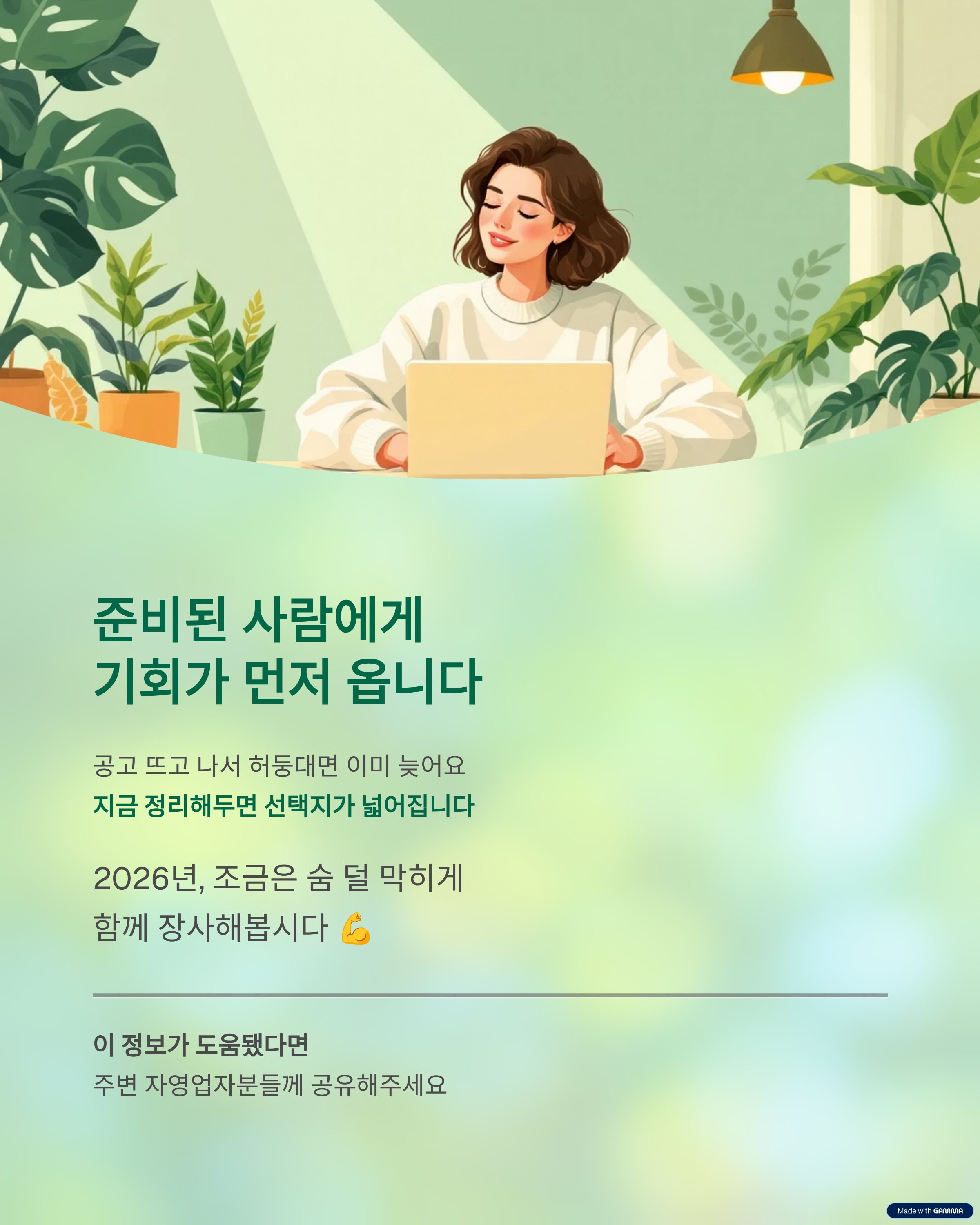 공고가 뜬 다음에 허둥대면 이미 늦은 경우가 많거든요. 내 매출 구간, 고정비 내역, 사업자 정보만 정리해둬도 선택지는 훨씬 넓어집니다.