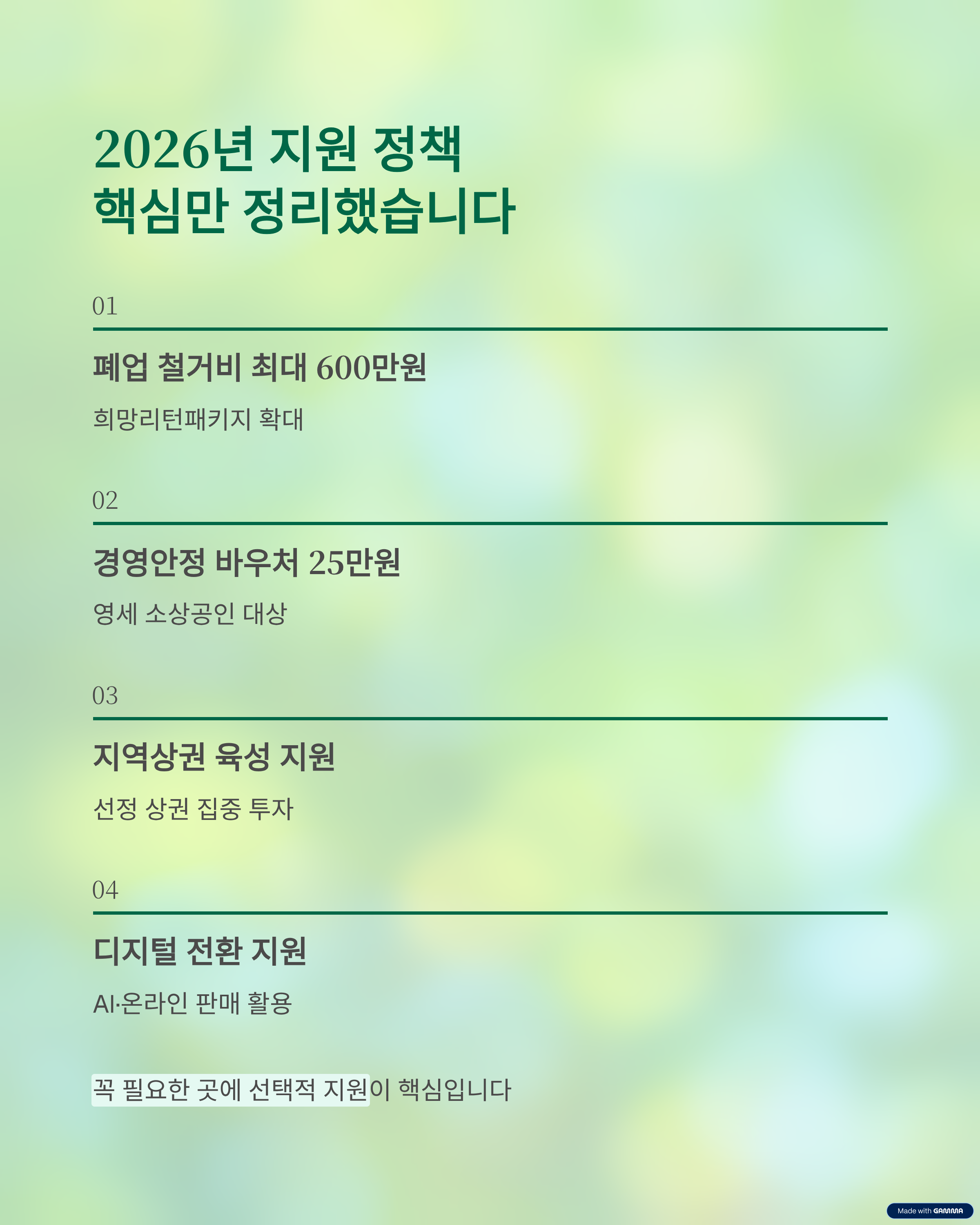 특히 최대 600만원 폐업 지원금이랑 25만원 경영안정 바우처는 꼭 짚고 넘어가야 할 부분이더라고요.