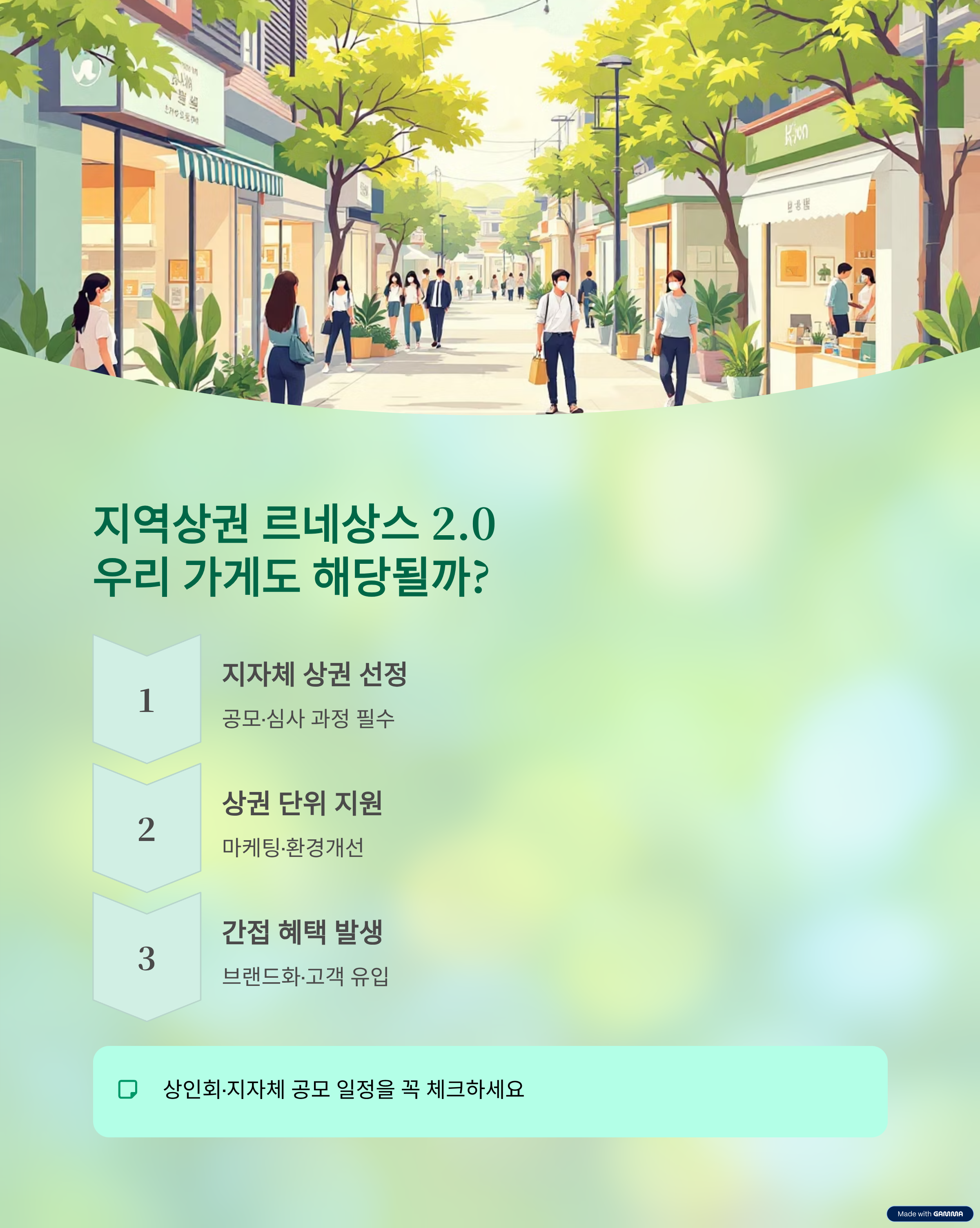 지역상권 르네상스는 보통 지자체 공모/선정이 핵심이에요. 내 점포가 속한 상권이 후보로 올라갈 가능성이 있는지, 상인회나 주민센터/지자체 공지(상권사업 공모)를 자주 체크해두면 좋아요.